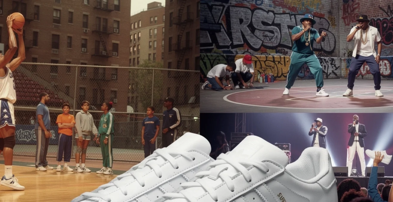 Pourquoi cette préférence ? D’abord, pour la robustesse : la coque protège les orteils des chocs et des surfaces irrégulières. Ensuite, pour l’esthétique : la silhouette blanche se couvre facilement de peinture, de poussière, de traces d’aventures nocturnes, devenant un carnet de route visuel de leurs exploits. Comme les murs qu’ils recouvrent, leurs sneakers racontent une histoire. Pour les crews du Bronx et de Brooklyn, la Superstar s’inscrit ainsi dans un code vestimentaire du graffiti où chaque détail – de la casquette au shell toe – participe à une identité collective.