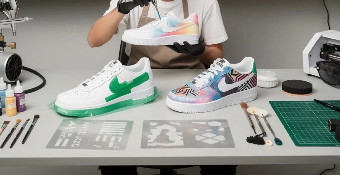Pour travailler dans de bonnes conditions, un set d’outils professionnels dédiés à la customisation de sneakers est indispensable. Outre les pinceaux de différentes tailles, le matériel de base comprend un aérographe (comme l’Iwata Eclipse), un compresseur réglable, du ruban de masquage de qualité, des cutters de précision et des abrasifs fins. À cela s’ajoutent les pochoirs en Mylar, les godets de mélange, les pipettes et les palettes pour contrôler les proportions de peinture et de médium.
