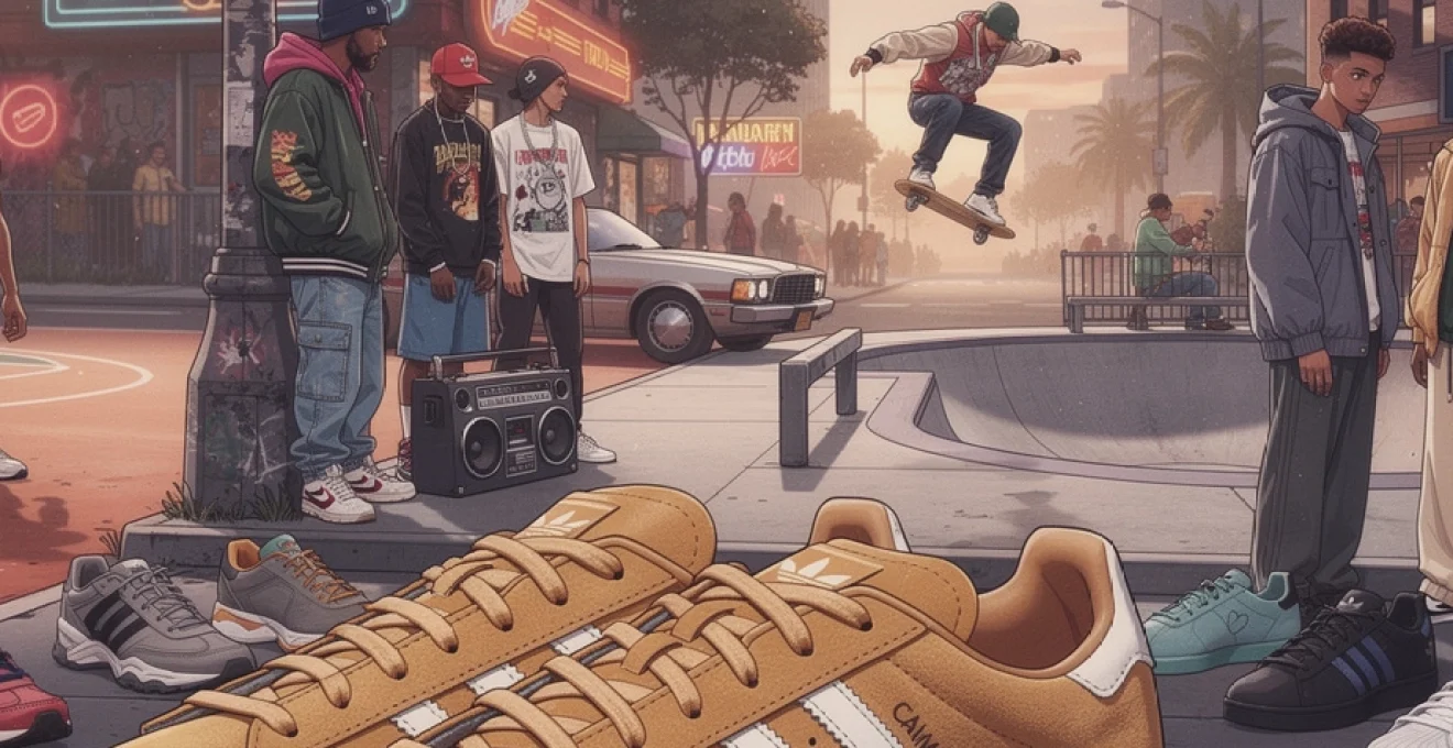 La bascule de la Adidas Campus du terrain de basket vers la rue se joue véritablement au début des années 80, alors que le hip-hop explose sur la côte Est des États-Unis. Dans les quartiers new-yorkais, les crews de rappeurs, graffeurs et breakdancers cherchent des sneakers à la fois robustes, confortables et stylées. La Campus coche toutes les cases : profil bas, tige en suède souple, semelle résistante et identité visuelle forte grâce aux trois bandes. Rapidement, elle s’impose comme une alternative plus discrète mais tout aussi crédible que la Superstar, devenue emblématique avec Run-D.M.C.